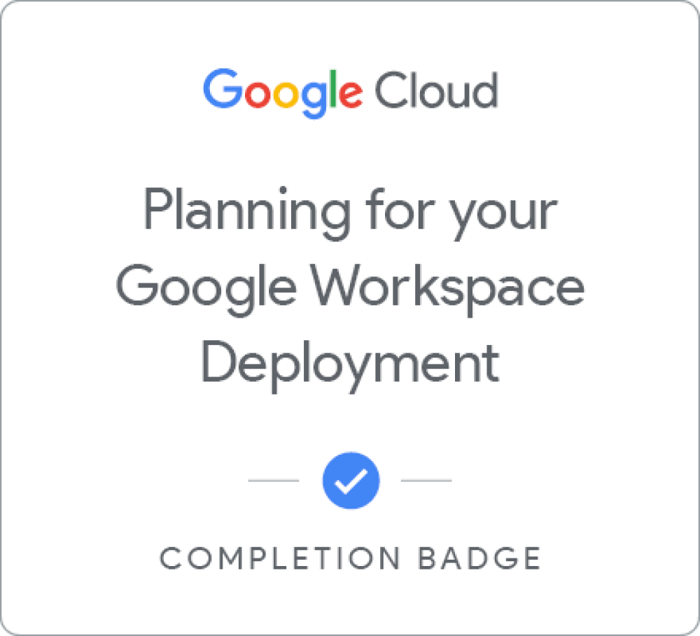Earn a skill badge by completing the Configure your Workplace: Google Workspace for IT Admins quest, where you will get try out the Admin role for Workspace and learn to provision Groups, manage applications, security, and manage Meet. A skill badge is an exclusive digital badge issued by Google Cloud in recognition of your proficiency with Google Cloud products and services and tests your ability to apply your knowledge in an interactive hands-on environment. Complete the skill badge quest, and final assessment challenge lab, to receive a digital badge that you can share with your network.
