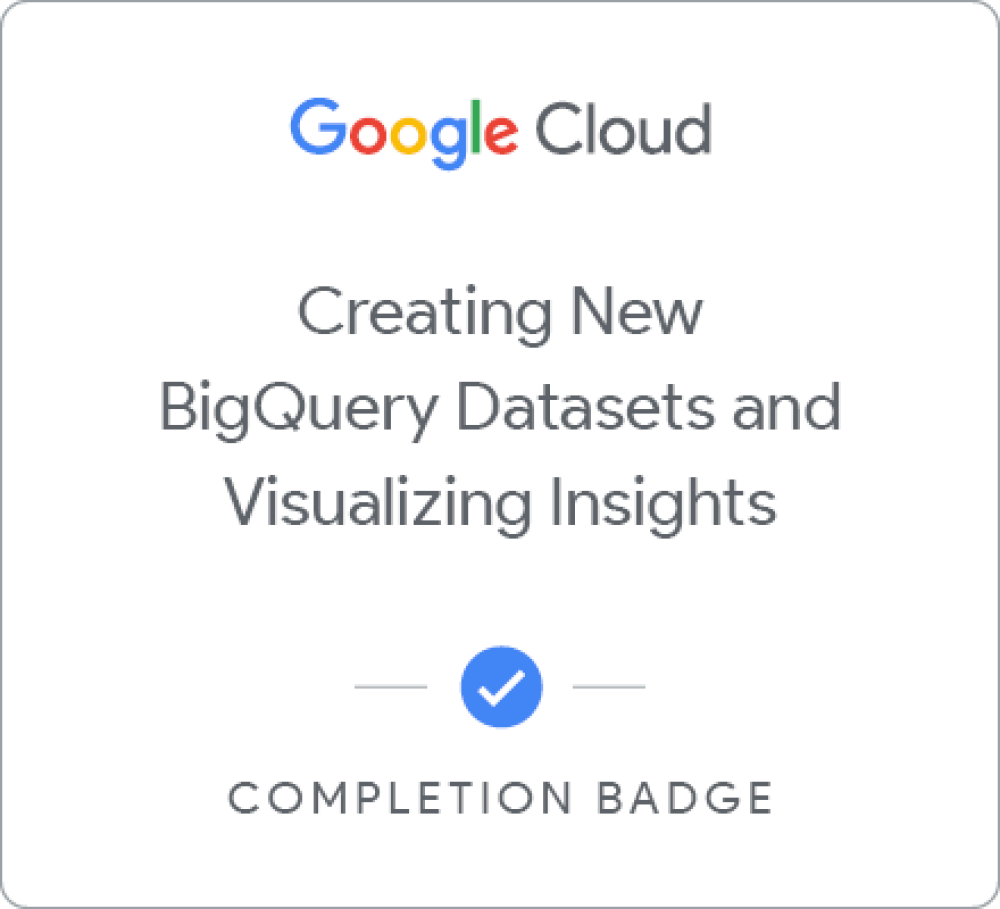 Complete the introductory Derive Insights from BigQuery Data skill badge course to demonstrate skills in the following: Write SQL queries.Query public tables.Load sample data into BigQuery.Troubleshoot common syntax errors with the query validator in BigQuery.Create reports in Looker Studio by connecting to BigQuery data.