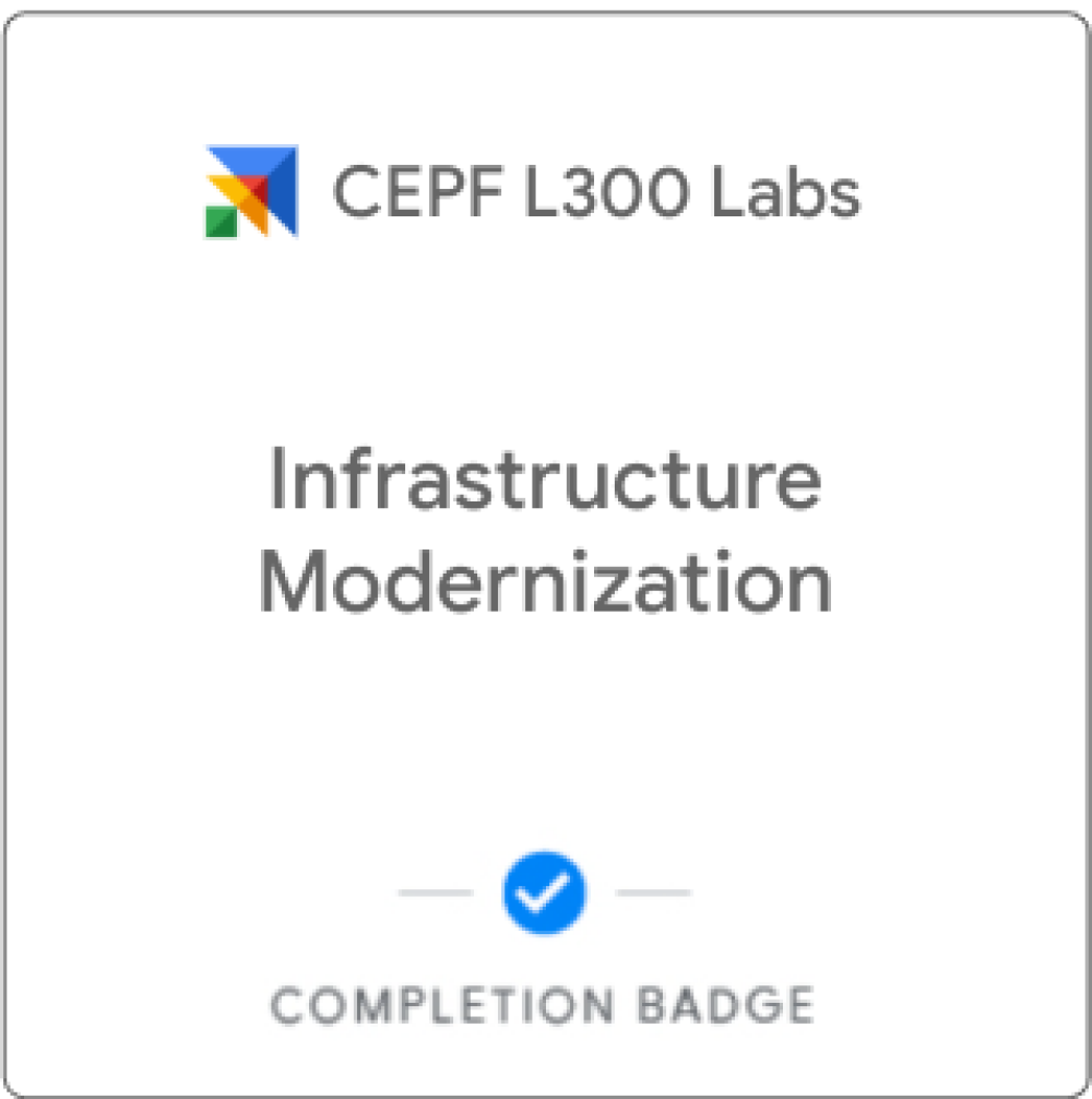 This Infrastructure Modernization course consists of a series of advanced-level labs designed to validate your proficiency in modernizing a customer's IT infrastructure using Google Cloud. Each lab presents a set of the required tasks that you must complete with minimal assistance. You must score 80% or higher for each lab to complete this course, and fulfill your CEPF L300 Infrastructure Modernization requirement. For technical issues with a Challenge Lab, please raise a Buganizer ticket using this CEPF Buganizer template: go/cepfl300labsupport To enroll in the course, navigate to the CEPF L300 Infrastructure Modernization Quiz section and click on the Start module button. Upon enrollment, all previously completed labs will be indicated with green check marks.