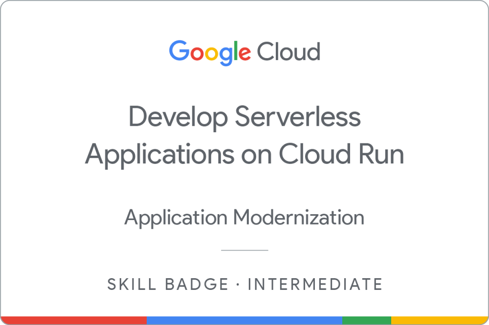 Complete the intermediate Develop Serverless Applications on Cloud Run skill badge course to demonstrate skills in the following: integrating Cloud Run with Cloud Storage for data management, architecting resilient asynchronous systems using Cloud Run and Pub/Sub, constructing REST API gateways powered by Cloud Run, and building and deploying services on Cloud Run.