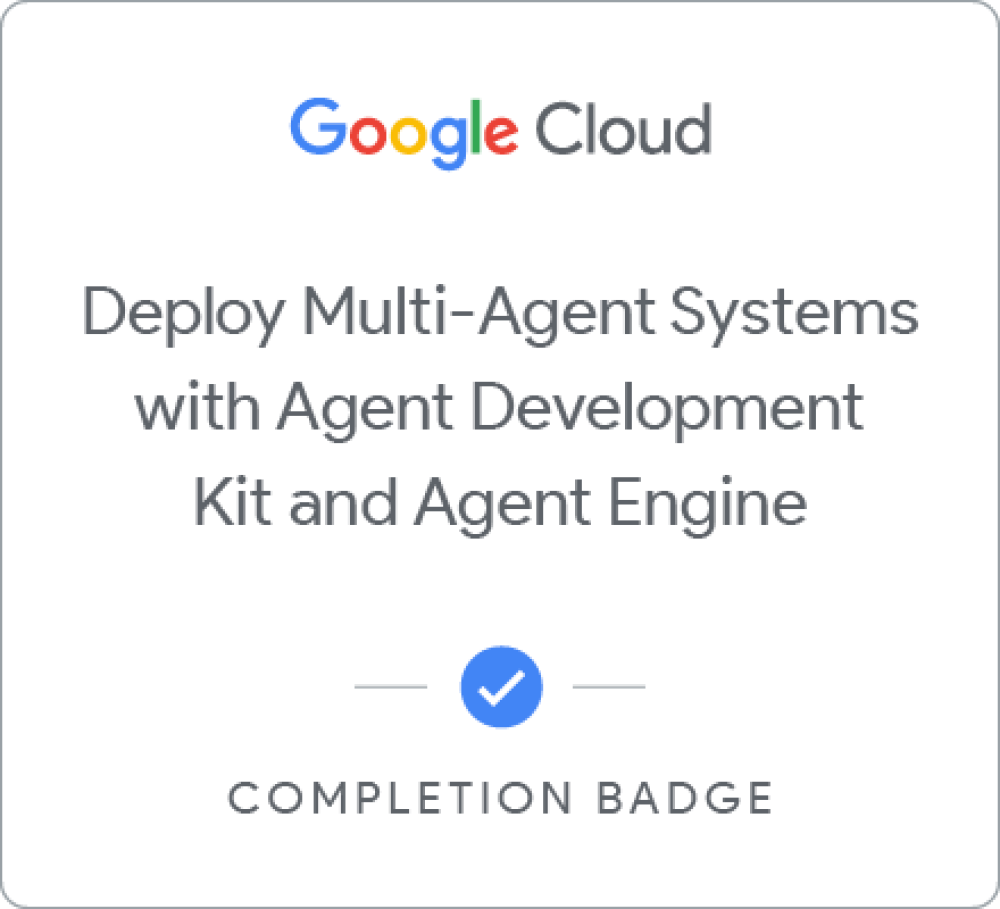 Earn a completion badge by completing the Deploy Multi-Agent Systems with Agent Development Kit and Agent Engine quest, where you learn about ADK Agents and the deployment of ADK Agents to Agent Engine. A completion badge is a digital badge issued by Google Cloud in recognition of your proficiency with Google Cloud products and services in an interactive hands-on environment.