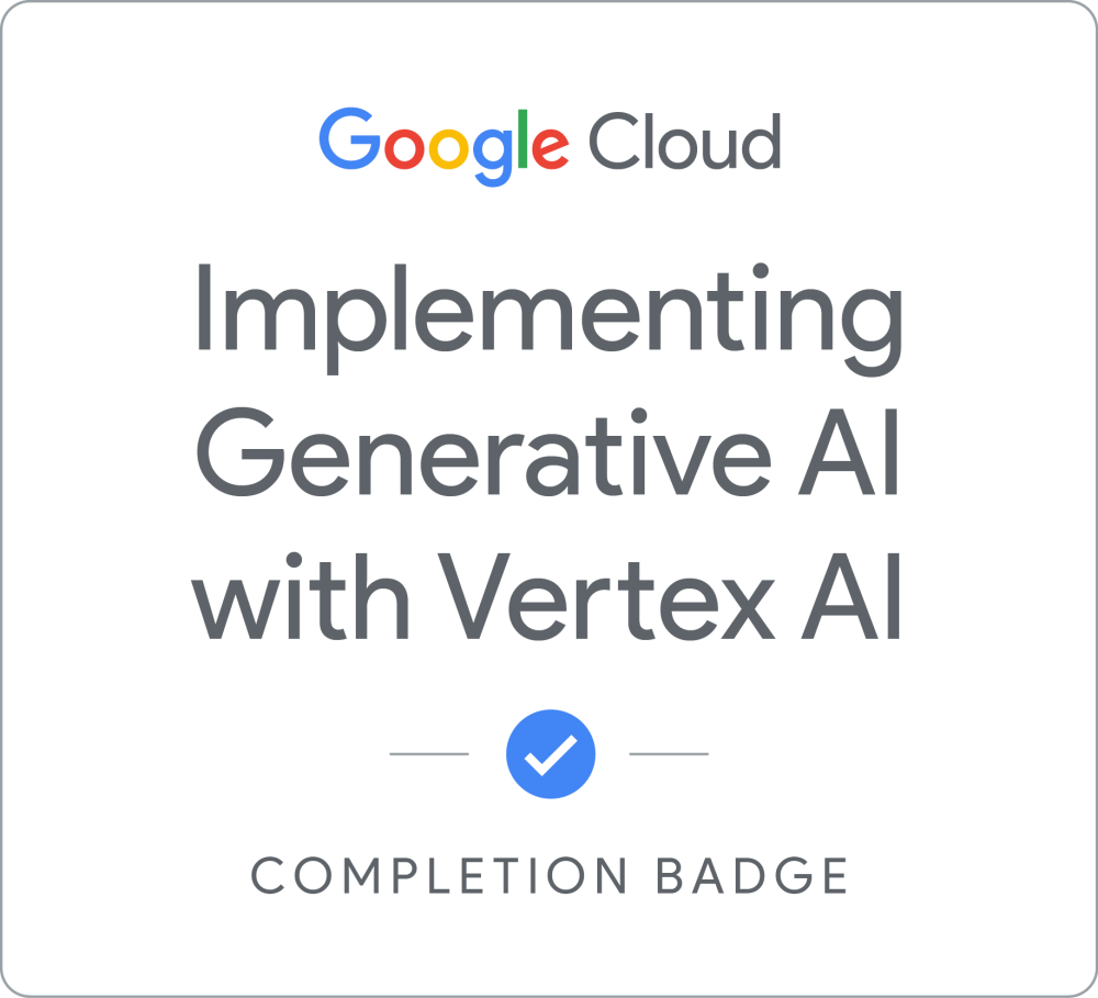 Earn a skill badge by completing the Introduction to Generative AI, Introduction to Large Language Models and Introduction to Responsible AI courses. By passing the final quiz, you'll demonstrate your understanding of foundational concepts in generative AI. A skill badge is a digital badge issued by Google Cloud in recognition of your knowledge of Google Cloud products and services. Share your skill badge by making your profile public and adding it to your social media profile.