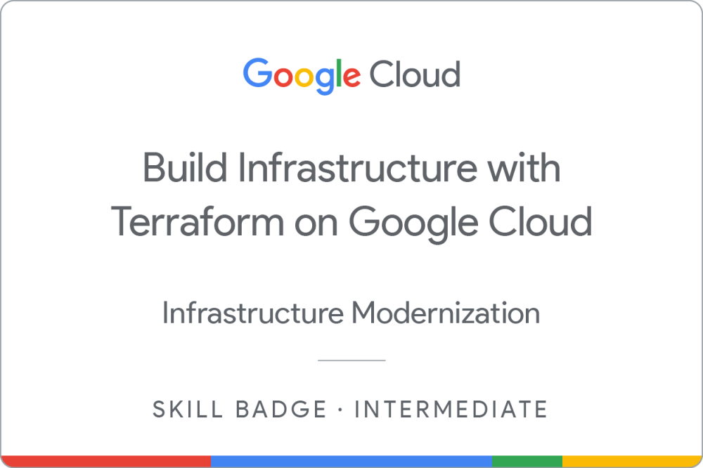 Complete the intermediate Build Infrastructure with Terraform on Google Cloud skill badge to demonstrate skills in the following: Infrastructure as Code (IaC) principles using Terraform, provisioning and managing Google Cloud resources with Terraform configurations, effective state management (local and remote), and modularizing Terraform code for reusability and organization.