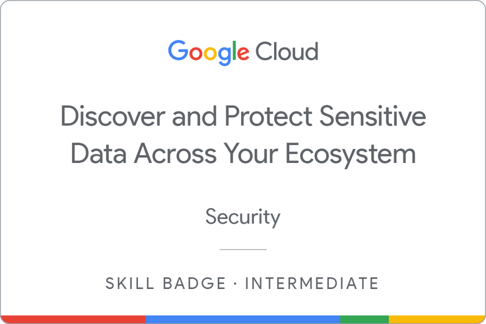 Complete the intermediate Discover and Protect Sensitive Data Across Your Ecosystem skill badge to demonstrate skills in the following: using Sensitive Data Protection services (including the Cloud Data Loss Prevention (DLP) API) to discover, inspect, redact, and de-identify sensitive data across your Google Cloud ecosystem including Cloud Storage files, BigQuery data, and Gen AI model responses.