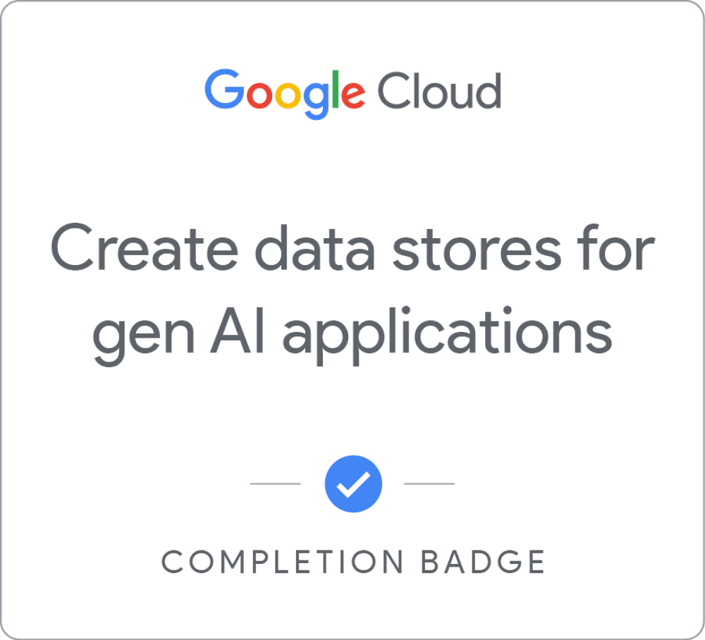 Complete the Create and maintain Vertex AI Search data stores skill badge to demonstrate your proficiency in building various types of data stores used in Vertex AI Search applications. A skill badge is an exclusive digital badge issued by Google Cloud in recognition of your proficiency with Google Cloud products and services and tests your ability to apply your knowledge in an interactive hands-on environment. Complete the assessment challenge lab, to receive a skill badge that you can share with your network. When you complete this course, you can earn the badge displayed here and claim it on Credly! Boost your cloud career by showing the world the skills you have developed!