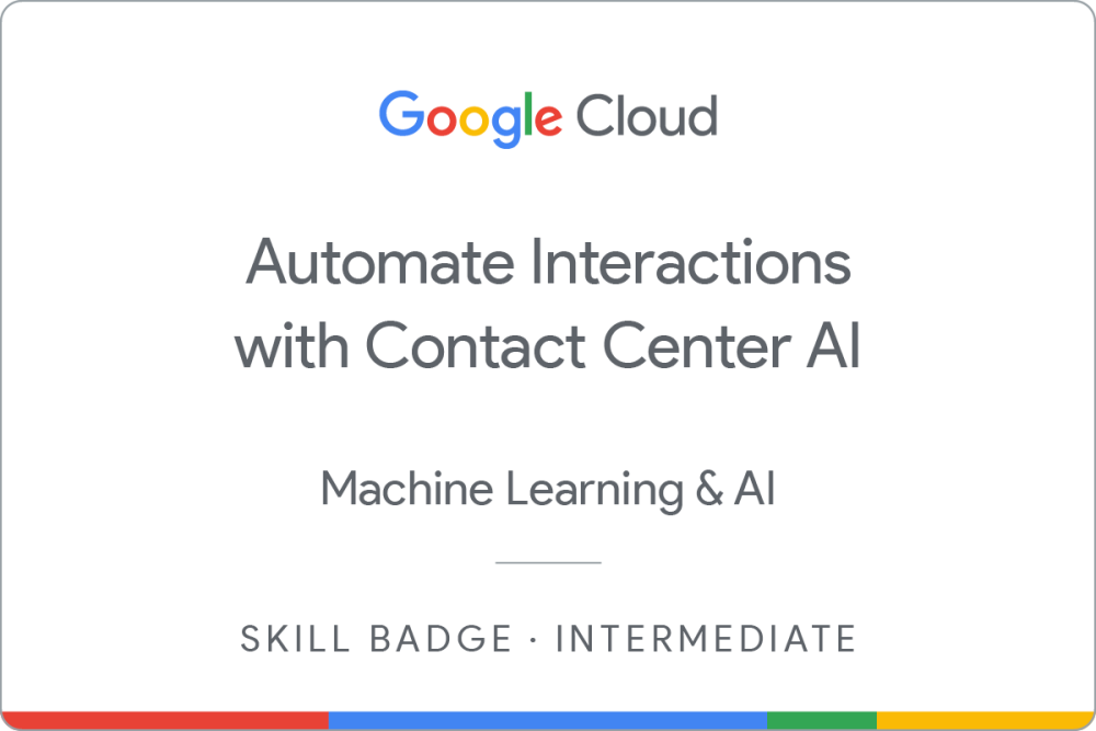 Earn a skill badge by completing the Automate Interactions with Contact Center AI quest, where you will learn about the features of Contact Center AI, including how to Build a virtual agent, Design conversation flows for your virtual agent; Add a phone gateway to your virtual agent; Use Dialogflow for troubleshooting; Review logs and debug your virtual agent. A skill badge is an exclusive digital badge issued by Google Cloud in recognition of your proficiency with Google Cloud products and services and tests your ability to apply your knowledge in an interactive hands-on environment. Complete the skill badge quest, and final assessment challenge lab, to receive a digital badge that you can share with your network.