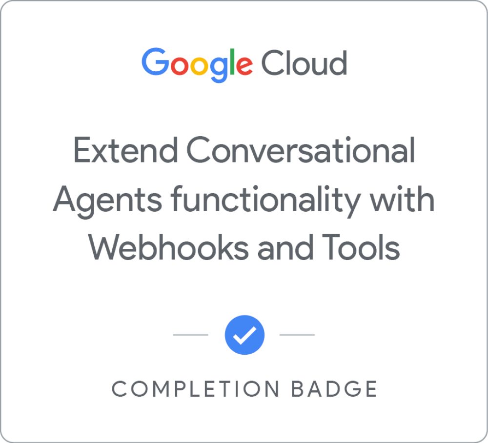 Complete the Extend agent functionality with Webhooks, Tools, and Integrations skill badge to demonstrate your ability to let conversational agents take actions. You will create a flow that calls a webhook and a playbook with a tool and combine them into a hybrid agent. You'll also prepare custom payload for rich content experiences in the Conversational Messenger. A skill badge is an exclusive digital badge issued by Google Cloud in recognition of your proficiency with Google Cloud products and services and tests your ability to apply your knowledge in an interactive hands-on environment. Complete the assessment challenge lab, to receive a skill badge that you can share with your network. When you complete this course, you can earn the badge displayed here and claim it on Credly! Boost your cloud career by showing the world the skills you have developed!