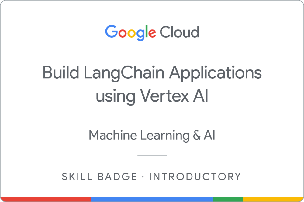 Complete the introductory Build LangChain Applications using Vertex AI skill badge to learn how to build Generative AI applications using LangChain and the Retrieval Augmented Generation (RAG) technique for text-based content, powered by Vertex AI's advanced Generative AI capabilities. Discover how to integrate powerful large language models (LLMs) with search and retrieval workflows, boosting the accuracy and relevance of your generated content. Earn a Google Cloud skill badge and showcase your expertise by completing the course and its final assessment challenge lab.