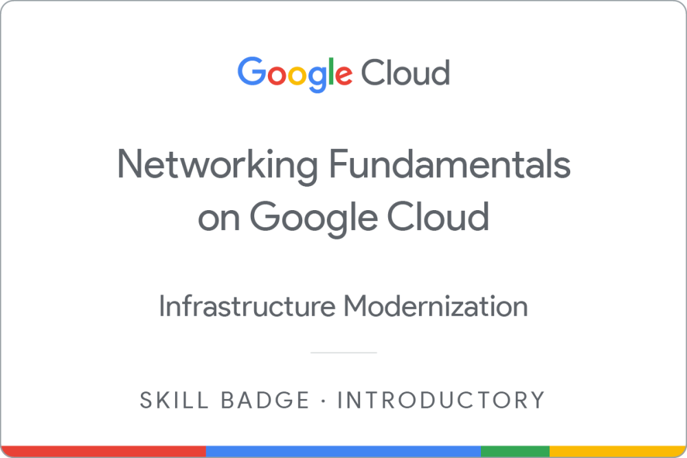 Earn a skill badge by completing the Networking Fundamentals on Google Cloud quest, where you learn how to work with VPC networks and load balancers on Google Cloud. A skill badge is an exclusive digital badge issued by Google Cloud in recognition of your proficiency with Google Cloud products and services and tests your ability to apply your knowledge in an interactive hands-on environment. Complete this Skill Badge, and the final assessment challenge lab, to receive a digital badge that you can share with your network.