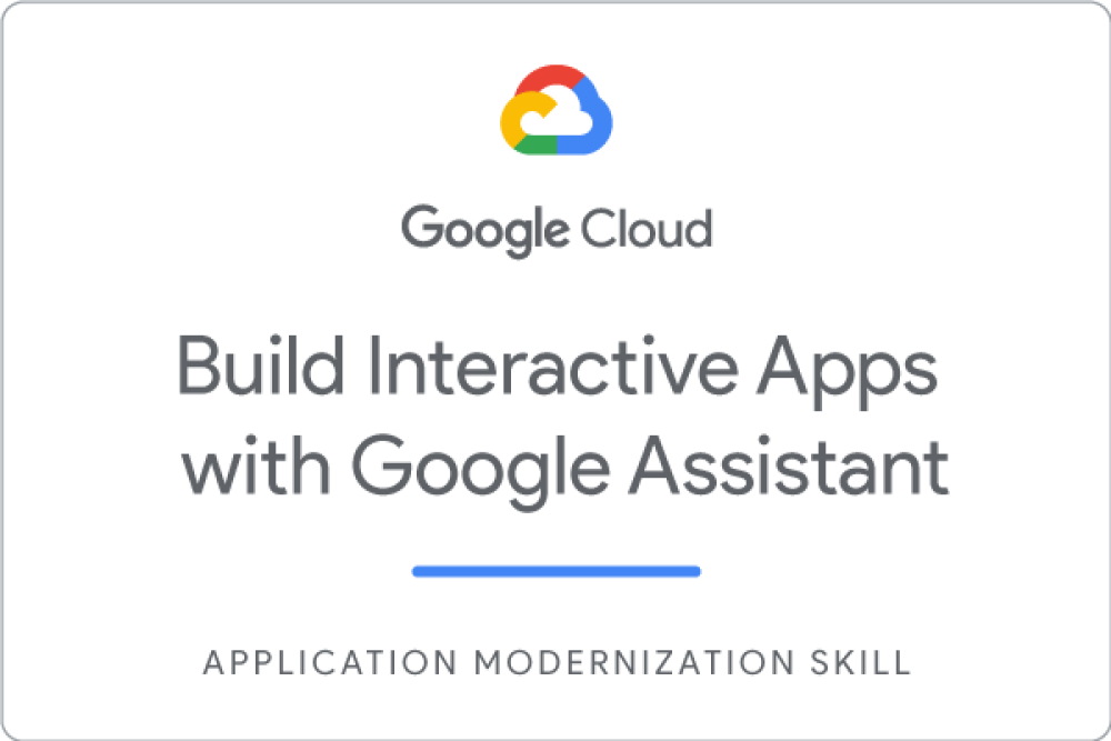 Earn a skill badge by completing the Build Interactive Apps with Google Assistant quest, where you will learn how to build Google Assistant applications, including how to: create an Actions project, integrate Dialogflow with an Actions project, test your application with Actions simulator, build an Assistant application with flash cards template, integrate customer MP3 files with your Assistant application, add Cloud Translation API to your Assistant application, and use APIs and integrate them into your applications. A skill badge is an exclusive digital badge issued by Google Cloud in recognition of your proficiency with Google Cloud products and services and tests your ability to apply your knowledge in an interactive hands-on environment. Complete the skill badge quest, and final assessment challenge lab, to receive a digital badge that you can share with your network.
